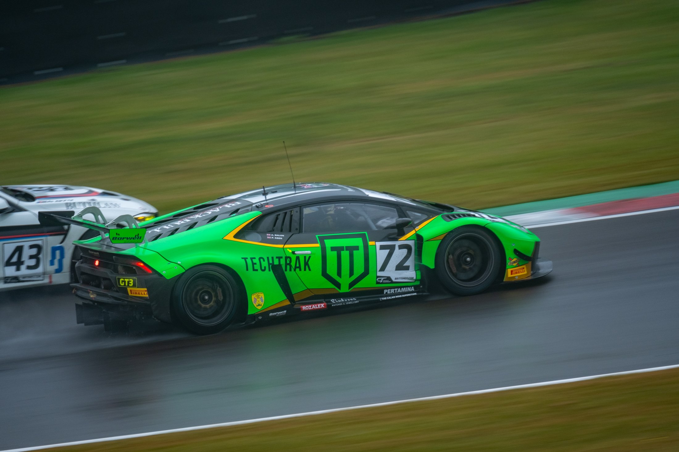 The Lamborghini Huracan GT3 EVO of Adam Balon (GBR) and Phil Keen (GBR) run by Barwell Motorsport laps traffic at Schwanz on the Donington Park Grand Prix circuit during the third round of the 2020 Intelligent Money British GT Championship season.