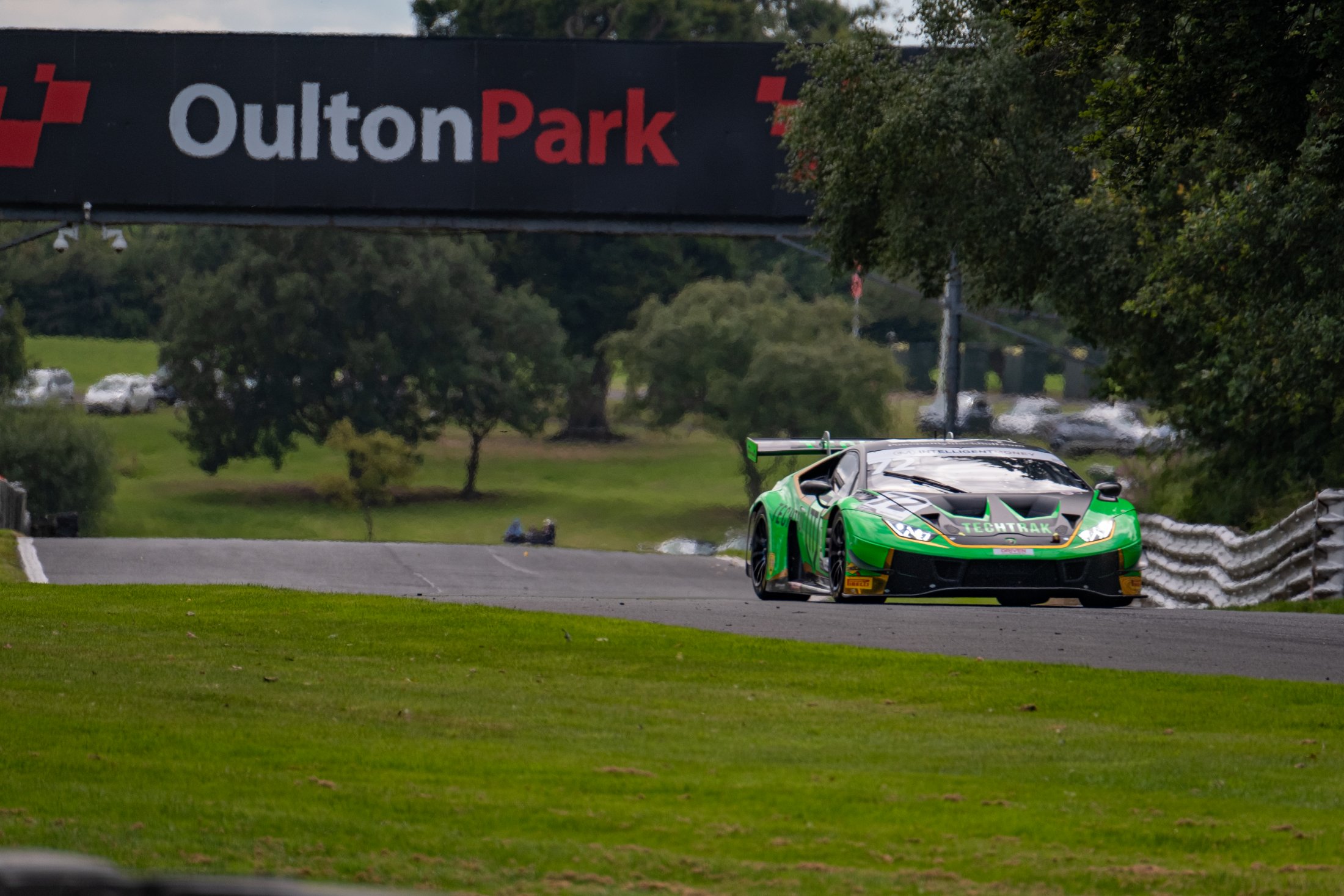 The Lamborghini Huracan GT3 EVO of BTCC Ace Rob Collard (GBR) and Sandy Mitchell (GBR) run by Barwell Motorsport at Clay Hill on the Oulton Park International circuit during the opening round of the 2020 Intelligent Money British GT Championship season.